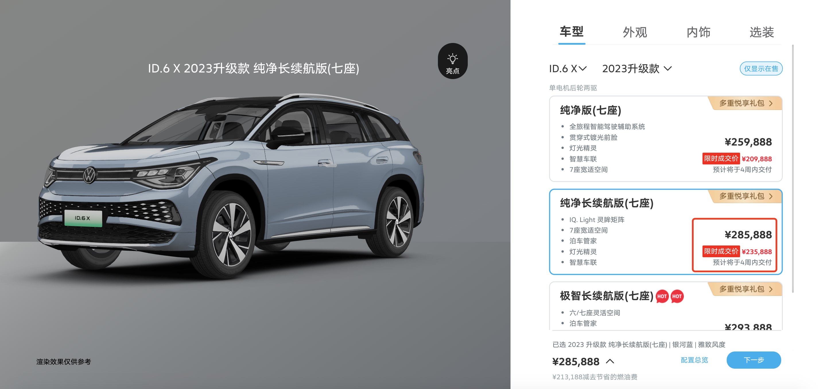 動力續(xù)航上,ID.6 X提供多種性能、續(xù)航版本,主銷車型配備寧德時(shí)代三元鋰電池,容量為83.4千瓦時(shí),支持0.67小時(shí)快充,最高續(xù)航617公里。同樣,作為ID.家族旗艦級SUV,上汽大眾為ID.6 X推出限時(shí)優(yōu)惠,綜合優(yōu)惠至高5萬元。從官網(wǎng)顯示,ID.6 X長續(xù)航版指導(dǎo)價(jià)28.5888萬元,限時(shí)優(yōu)惠價(jià)格23.5888萬元,25萬元落地一款6座純電中大型SUV,是不是很誘人?