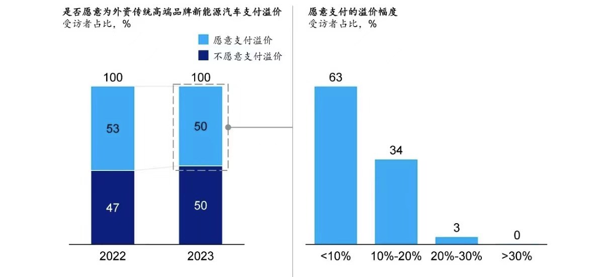 在《2024麥肯錫中國汽車消費者洞察》中顯示,50%的受訪者不愿意為外資品牌支付溢價,相比于無形的品牌力,消費者現在更愛實在的技術與配置。