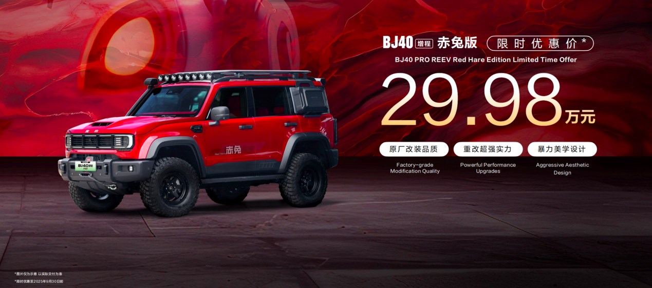 上市以來,BJ40增程進階版訂單比例超過75%。北京越野董事長王昊宣布,BJ40增程赤兔版正式發(fā)布,實現(xiàn)顏值、性能、安全三大升級,大幅提升整車視覺沖擊力、越野性能以及安全防護,改裝提升項價值超20萬元,限時優(yōu)惠價為29.98萬元(截止至9月30日),即刻可在“悅野圈APP”下單預(yù)存2000元創(chuàng)始基金,預(yù)計今年四季度正式交付。