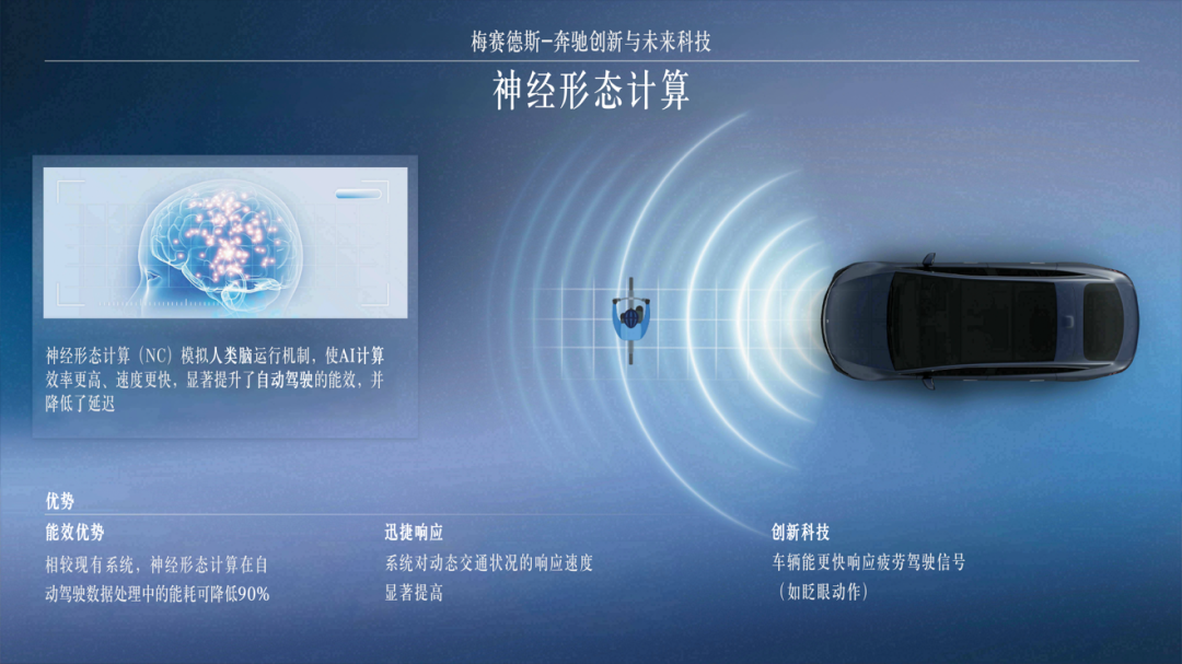 在車(chē)展開(kāi)幕前一天的梅賽德斯-奔馳品牌科技日上,率先帶來(lái)了全新純電長(zhǎng)軸距CLA和Vision V概念車(chē)的全球首秀,并展示了梅賽德斯-奔馳在神經(jīng)形態(tài)計(jì)算、In-drive制動(dòng)系統(tǒng)、太陽(yáng)能涂層等前沿科技成果。